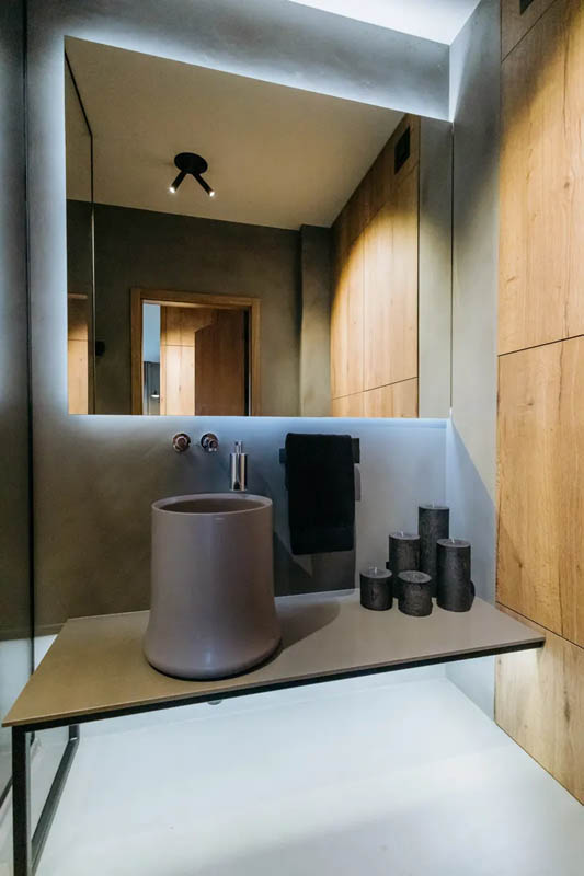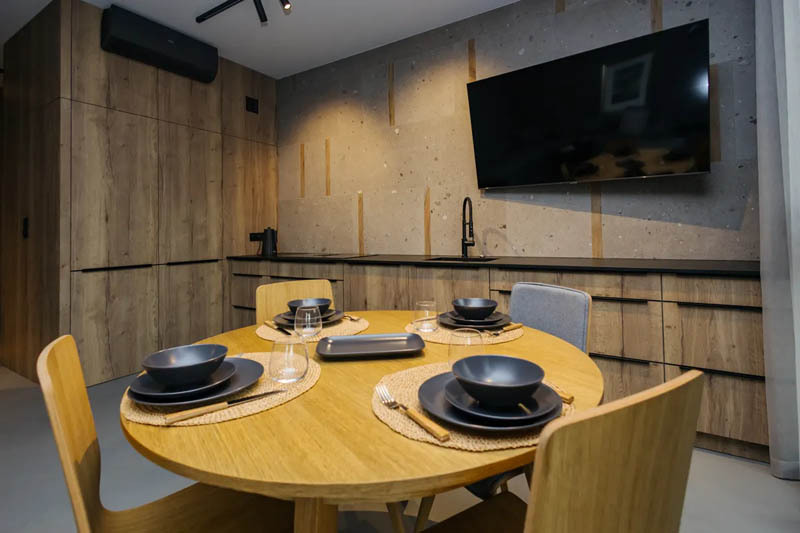 Lokal wykończone w stylu nowoczesnym z dominacją naturalnych materiałów takich jak drewno i beton architektoniczny. Szarości i ciepłe odcienie drewna nadają wnętrzu elegancji i przytulności.